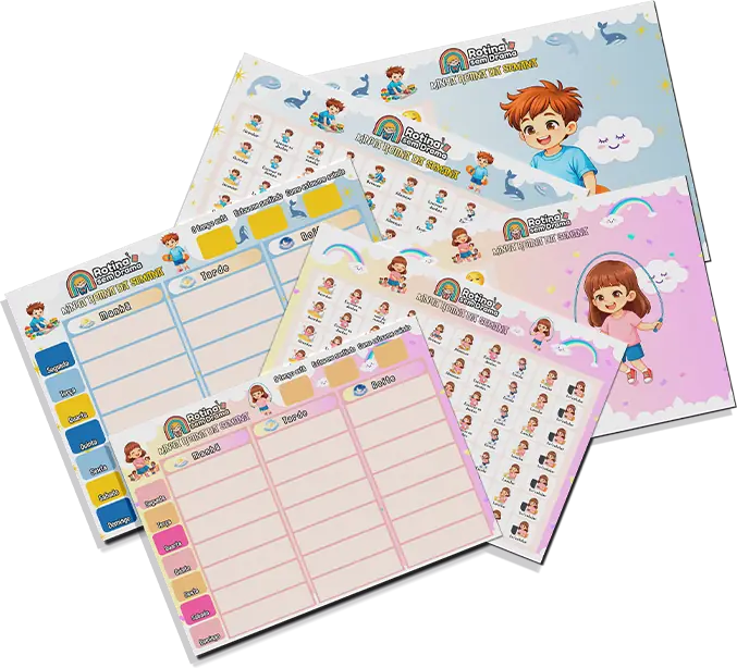 Um guia visual simples para organizar o dia do seu filho sem brigas, correria ou estresse.